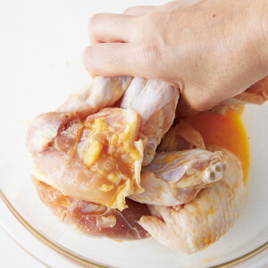 もも肉は余分な脂肪を取り除き、4~6等分に切る。手羽先はペーパータオルで水けを拭く。ボウルにもも肉と手羽先を入れ、【A】を加えてからめる。時々混ぜながら30分間以上おいて下味をつける。パセリは食べやすくちぎり、ペーパータオルで水けを拭く。