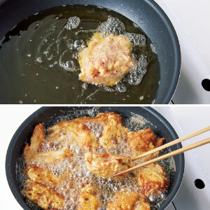 火を少し強めて油の温度を180℃に上げ、揚げた鶏肉の全量を入れる。強めの中火で2~3分間、きつね色になるまで揚げて取り出し、油をきる。