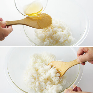 【すし酢】の材料をよく混ぜ合わせて砂糖と塩を溶かす。大きめのボウルにご飯を入れ、【すし酢】をしゃもじで受けながら回しかける。手早く切るように混ぜ、ほんのり温かいくらいに冷まし、12等分にして丸める。