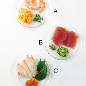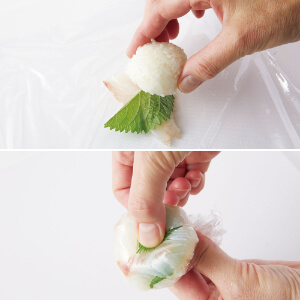 ラップを広げ、中央に【C】のたい1~2切れと青じそ1切れをのせ、すし飯1コ分をのせて包み、丸く形を整え、中央を少し押す。ラップを外して器に盛り、イクラの1/4量をのせる。