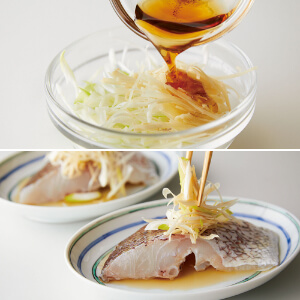 小さめの容器にねぎ、しょうがを入れ、ごま油小さじ2を加え、混ぜてからめる。1のたいに等分にのせる。