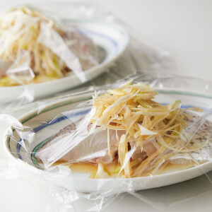 ごま油をからめたねぎとしょうがをのせてチンするだけで、香りのよい蒸し物ができ上がります。