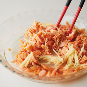 耐熱皿にさけを入れ、ラップをせずに電子レンジ(600W)に約1分間かける。様子を見て生っぽければさらに電子レンジに約1分間かける。取り出し、粗熱が取れたら皮と骨を取り除き、粗くほぐす。さけに、しょうが、酒・酢各少々を加えて混ぜ、軽く絞って汁けを除く。