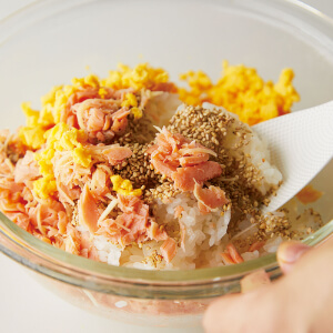 ボウルにご飯を入れ、【A】をよく混ぜて回しかけ、しゃもじで切るように混ぜる。ごまを指先でひねりつぶしながら加え、1のさけ、2のいり卵を加え(飾り用適量を残す)、サックリと混ぜる。冷めたら、みつばをザク切りにして加えて混ぜる。器に盛り、残しておいたいり卵をのせる。