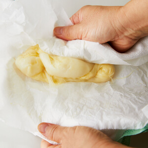 取り出してラップを外し、オーブン用の紙ごと持ち上げて布巾にのせる。布巾とオーブン用の紙を合わせて持ち、半分に折っては押し、位置を変えながら繰り返してこねる。チーズと餅がよく混ざってなめらかになったらこね終わり。