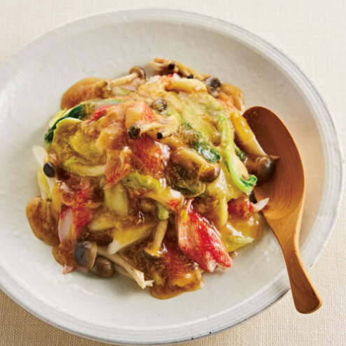 白菜の炒め物にしょうが入りのあんをかけたら、香りのいい中華おかずのでき上がり。