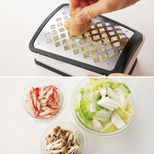 しょうがはよく洗い、傷や変色した部分などを除き、皮付きのまますりおろす。白菜は縦半分に切り、軸は4cm幅のそぎ切りに、葉は4cm幅に切る。しめじは根元の部分を切り落とし、小房に分ける。かにかまぼこはざっとほぐす。
