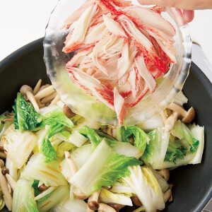 フライパンに油大さじ1を中火で熱し、白菜、しめじを入れて約3分間炒める。塩・こしょう各少々をふり、かにかまぼこを加えて約1分間炒め、火を止めて器に盛る。