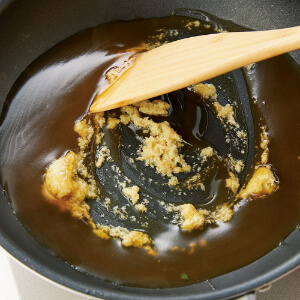 2のフライパンに水カップ1、【A】を入れて弱めの中火にかける。大きく混ぜながら煮立て、1のしょうがを加えて混ぜる。火を止め、2にかける。