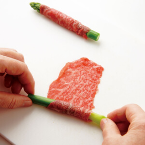 牛肉1枚を縦長に広げ、手前にアスパラガス1本を少し斜めに置いて巻いていく。両端を約1cm残す。残りも同様に巻く。