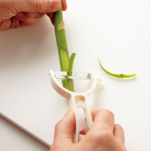 アスパラガスは根元1cm弱を切り落とし、ピーラーで根元から4~5cmの皮をむく。皮をむくと根元の堅い部分も食べやすくなる。