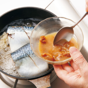 小さな容器にみそを入れ、5の煮汁大さじ2~3を入れて溶きのばし、回し入れる。再び落としぶたをして約5分間、煮汁にとろみが少しつくまで煮る。