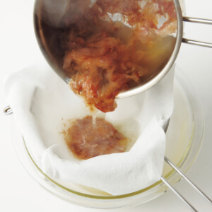 小さめの鍋に分量の水と昆布を入れ、約30分間おく。中火にかけ、煮立つ直前に昆布を取り出す。削り節を加え、再び煮立ったら火を止める。ペーパータオルを重ねたざるでこす。