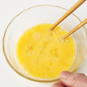 みつばは葉と軸(茎)に分け、軸(茎)は2cm幅に切る。【水溶き片栗粉】は混ぜておく。卵は卵白の小さい塊が残るくらいに軽く溶きほぐす。