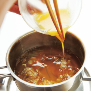 かきたま汁の卵をフワフワにする秘けつは″とろみ″。水溶き片栗粉で汁にとろみをつけておくと、卵が薄い膜状に広がってフワフワに。片栗粉を倍量の水で溶き、少しずつ加えるとよい。
