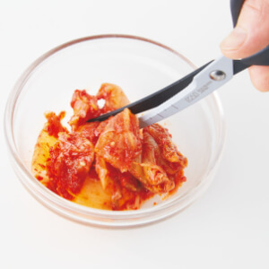 豚肉はキッチンばさみ(または包丁)で一口大に切ってボウルに入れ、焼き肉のたれをもみ込む。白菜キムチはキッチンばさみ(または包丁)で1cm幅に切り、豚肉に加える。ごま油小さじ1を加えて混ぜる。