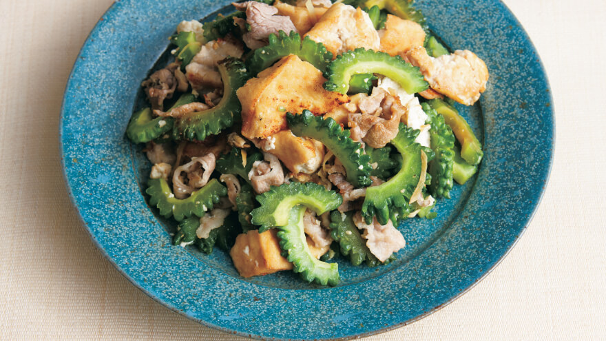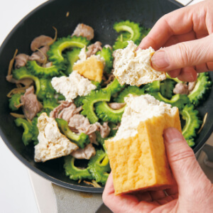 チャンプルーは沖縄の炒め物。豆腐を使うのがおなじみですが、厚揚げにすると水っぽくならず、コクが出ます。塩をまぶすとゴーヤーの苦みがマイルドに。