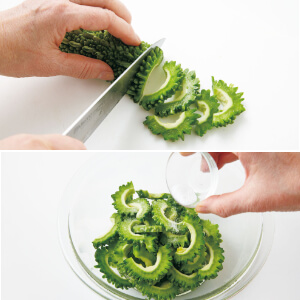 ゴーヤーは縦半分に切ってワタと種を除き、5~6mm幅の半月切りにする。塩小さじ1/2をふって全体にまぶし、約5分間おく。水でサッと洗い、ざるに上げて水けをよくきる。