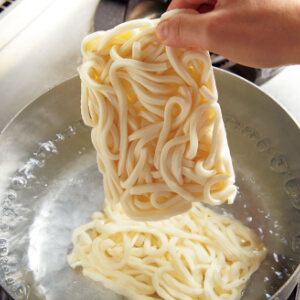 鍋にたっぷりの湯を沸かして冷凍うどんを入れ、袋の表示どおりにゆでる。流水でもみ洗いし、ざるに上げて水けをよくきり、ボウルに入れる。