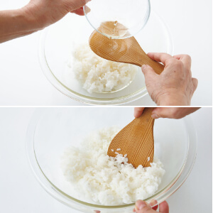 【合わせ酢】の材料をよく混ぜて砂糖と塩を溶かす。大きめのボウル、またはバットにご飯を入れ、しゃもじで軽くほぐす。【合わせ酢】をしゃもじに伝わらせながら全体に回しかける。しゃもじで切るように手早く混ぜ、時々底から返して【合わせ酢】を全体に行き渡らせる。