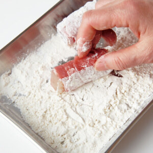 バットに小麦粉適量を入れ、1を1コずつ転がして全体に薄くまぶす。【A】は混ぜておく(たれ)。