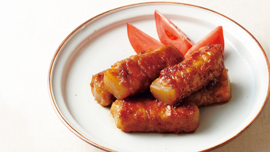 薄切り肉をこんにゃくに巻きつけてボリュームアップ。ご飯がすすむしょうが焼きにします。プルンとしたこんにゃくの食感も魅力です。