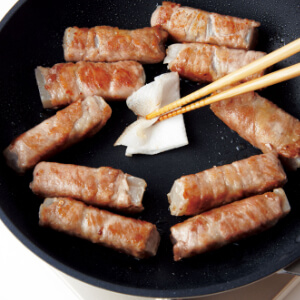 フライパンに油大さじ1を中火で熱し、2を巻き終わりを下にして並べ入れる。焼き色がついたら返し、各面を焼く。全体に焼き色がついたら、ペーパータオルで余分な脂を拭く。たれを回し入れ、強めの中火でからめる。