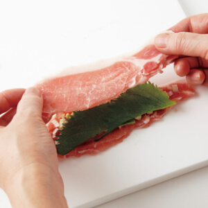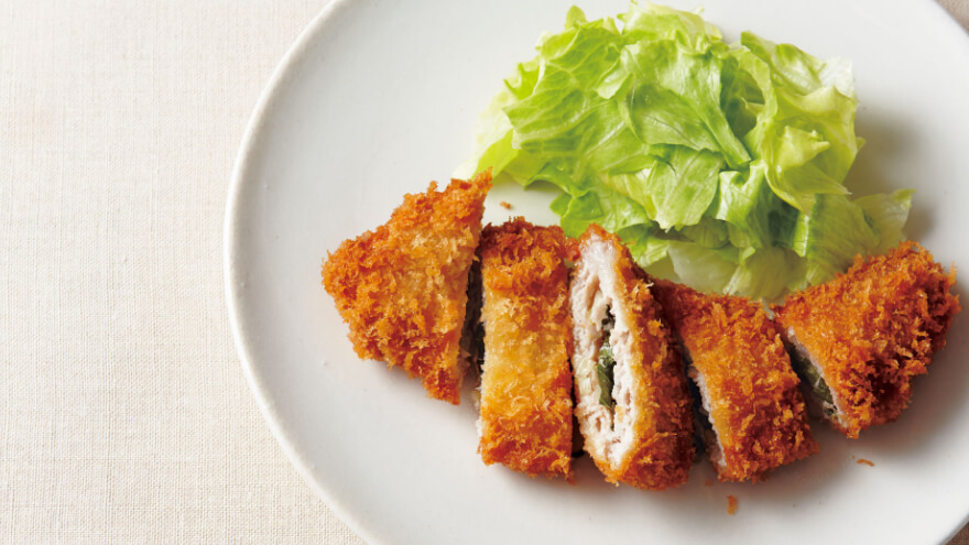 しゃぶしゃぶ用の肉を重ねて厚みを出した豚カツは、揚げ時間が短く、とっても柔らかです。間にはさんだ梅肉とねぎ、青じその風味でソースいらず。