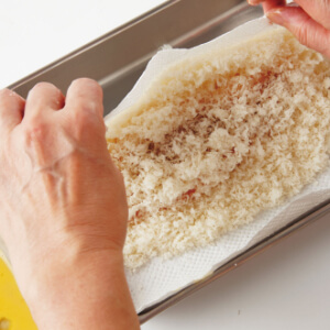 2の1組を両手でしっかり持って溶き卵のバットに入れ、返して両面にからめる。すぐにパン粉のバットに入れ、ペーパータオルを持って全体にまぶす。残りも同様に溶き卵とパン粉をつける。