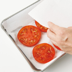 レタスはペーパータオルで水けを拭き、1cm幅に切る。トマトは上下を切り落とし、4等分の輪切りにし、ペーパータオルではさんで水けを拭く。食パンはオーブントースターなどでこんがりと焼く。