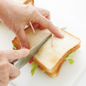 残りの食パンをバターを塗った面を下にしてのせ、手で押さえてなじませる。1組にピックまたはようじ2本を刺し、指で軽く押さえながら半分に切る。器に盛り、好みでピクルスやポテトチップスを添える。