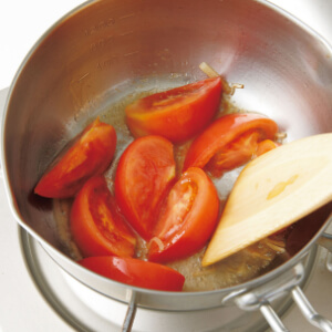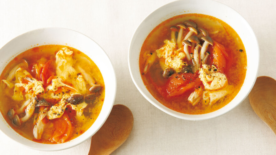 鍋に油を中火で熱し、しょうがを入れて炒める。香りがたったら、トマトを加えてサッと炒め、しめじを加えてさらに炒める。油が回ったらスープを加え、煮立ったら約3分間煮る。