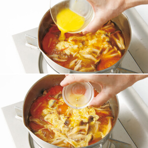 トマトはヘタを除き、8等分のくし形に切る。しめじは根元を切り落とし、小房に分ける。しょうがはせん切りにする。卵は溶きほぐす。