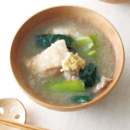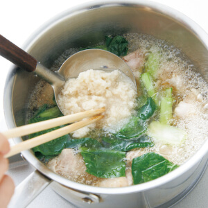 すりおろしたれんこんを入れると煮汁がトロトロに。鶏肉、小松菜入りで栄養のバランスも抜群のおかず汁です。しょうがの風味がアクセントに。