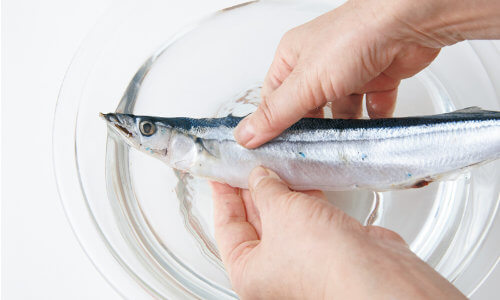 さんまは水の中で軽くこすって洗い、ぬめりや残っているウロコなどを除く。ペーパータオルで水けを拭き、斜め半分に切る。新鮮なさんまは内臓を除かなくてもよい。