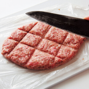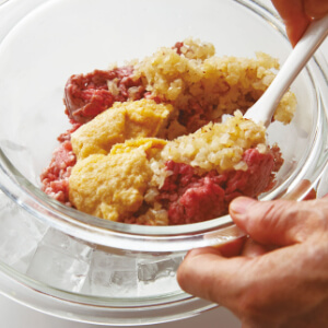 肉ダネは冷やしながら混ぜると脂が溶けにくくなって肉どうしがよくつながり、くせも出にくくなります。氷水でボウルの底を冷やしながら混ぜたり、手の熱で脂が溶けないよう、ゴムべらを使うのがおすすめです。