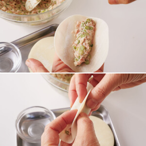 2を20等分し、ギョーザの皮の真ん中に細長くのせる。皮の上の真ん中の部分に水少々をつけ、上下の皮をくっつける。横は開いたままでよい。