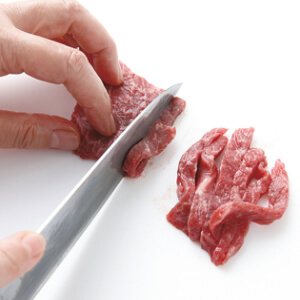 1. マッシュルームは根元を少し切り落とし、縦四つ割りにする。たまねぎは縦に薄切りにする。牛肉は7~8mm幅の細切りにし、塩小さじ1/2、こしょう・パプリカパウダー各少々をまぶして下味をつける。