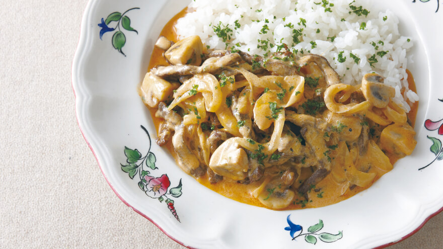 生クリームを使って白く仕上げるタイプのビーフストロガノフです。生クリームのまろやかな味わいが牛肉のうまみを引き立てます。