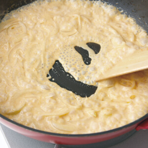 3. 全体になじんだら、白ワインを加える。強めの中火にして混ぜながら煮立て、汁の量が半分くらいになるまで煮詰める。スープを加え、さらに半分くらいに煮詰める。生クリームを加えて混ぜ、焦げないよう中火にして2~3分間、底が見えるくらいまで煮詰める。そのつどしっかり煮詰めることでうまみや風味が凝縮される。