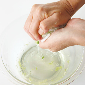 白菜を塩水につけて水分を引き出し、両手でしっかりと絞る。水けを除くことで味がなじみやすくなる。
