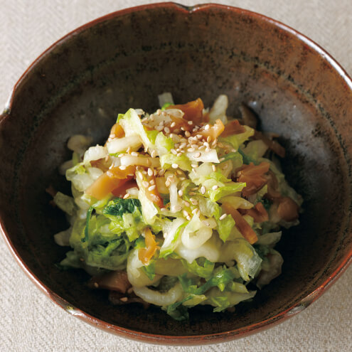 さっぱりとした甘酸っぱい中華味のあえ物。ザーサイの風味が食欲をそそり、白菜がモリモリ食べられます。