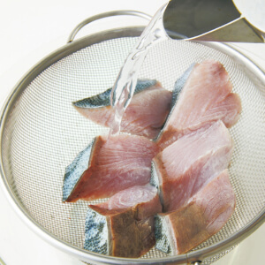 1. ぶりは1切れを3等分に切る。ざるに並べて塩少々をふり、約5分間おく。熱湯を回しかけ、湯をきる(霜降り)。こうするとくせが出にくくなり、煮くずれしにくくなる
