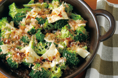 電子レンジにかけたブロッコリーが熱いうちにチーズをのせます。溶けたチーズとしょうゆ味のおかかがブロッコリーにからんでくせになるおいしさです。