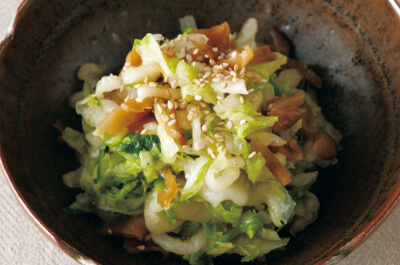さっぱりとした甘酸っぱい中華味のあえ物。ザーサイの風味が食欲をそそり、白菜がモリモリ食べられます。