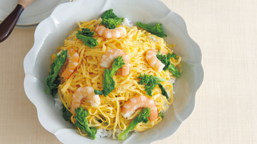 薄焼き卵を細切りにした錦糸卵をたっぷりと広げ、えびと菜の花をのせたら花畑のよう。菜の花は茎を刻んですし飯に混ぜて、春の香りを味わい尽くします。