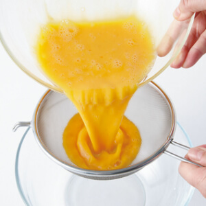 2. ボウルに卵を溶きほぐし、砂糖小さじ2、塩少々を加えて混ぜ、ざるでこして卵白の塊などを取り除く(卵液)。