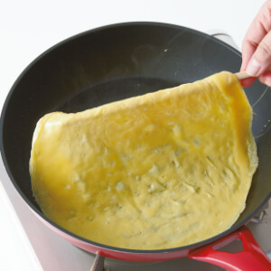 3. フライパンにペーパータオルで油を薄く塗って中火で熱する。弱火にして卵液1/4量を入れ、フライパンを傾けて全体に薄く広げる。縁のほうが乾いてきたら火を止め、菜箸を卵の下に入れ、持ち上げて返す。再び弱火にかけてサッと焼き、平らなざるに取り出す。残りも同様に焼く。粗熱が取れたら半分に切り、2枚ずつ重ねて巻く。端から細く切り(錦糸卵)、ほぐしておく。