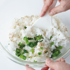 6. 大きめのボウルに炊き上がったご飯を入れ、よく混ぜた【合わせ酢】をしゃもじに伝わらせながら全体に回しかける。しゃもじで切るようにサックリと混ぜ、うちわであおいで、ほんのり温かいくらい(人肌)に冷ます。