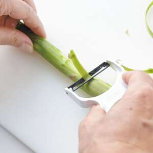 アスパラガスは根元1cmを切り落とす。大きめのはかま(三角の部分)を包丁で除き、根元から1/3の皮をピーラーで薄くむく。長さを半分に切る。